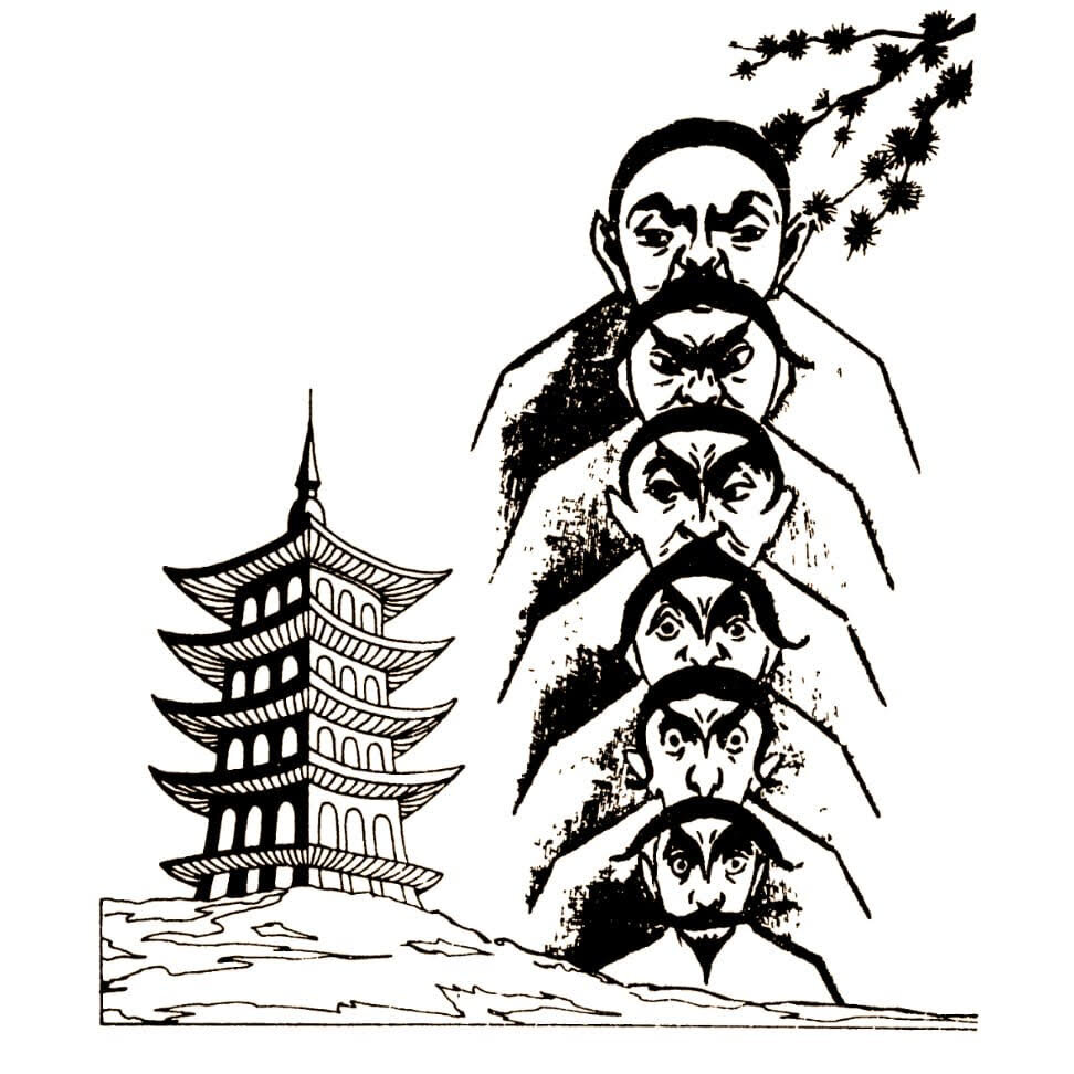 Одна из самых знаменитых акробатических команд всех времен и народов, увенчанная многими наградами великолепная шанхайская шестерка изображена на нашем рисунке в тот момент, когда собирается продемонстрировать свой коронный номер — пирамиду. Прежде чем они станут взбираться на плечи друг другу, рассмотрите картинку и скажите, сколько лиц целиком — не закрытых, даже частично, другими лицами, вы смогли насчитать. Шесть, пять или только одно или три, а может два или ..?