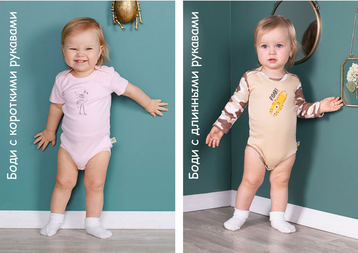 - 1—2 боди с длинным рукавчиком. Малышу понадобятся и боди с рукавом, которые не дадут ему замерзнуть при низкой температуре.