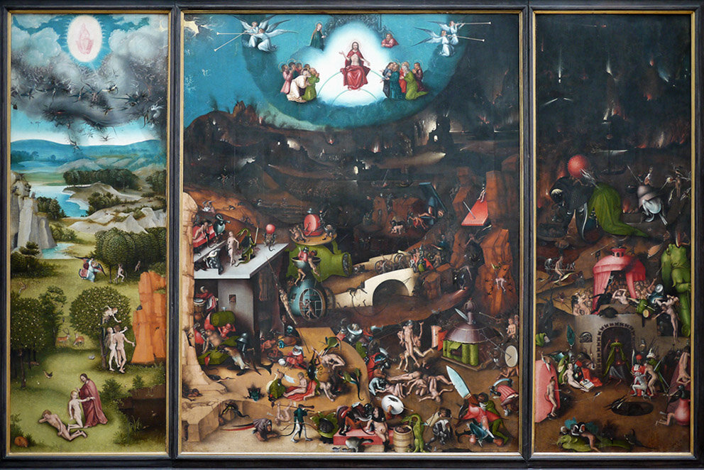 Триптих Босха «Страшный суд» был написан в 1505 и сейчас выставляется в Academy of fine Arts в Вене. В далёком 16 веке люди могли видеть эту картину в церкви, причём по будням прихожане видели только внешнюю сторону закрытого триптиха. А по праздникам створки открывали, чтобы верующие могли увидеть картину ужасов ада. Это должно было производить большое впечатление: взгляд не привыкал к изображённому, и человек снова и снова задумывался о том, как он ведёт свою жизнь.