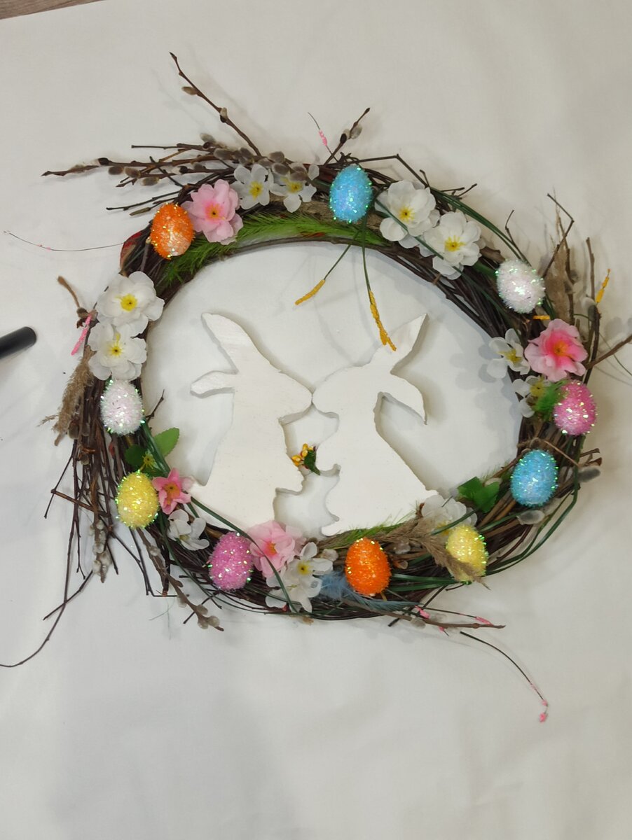 Пасхальный венок своими руками 🐣 Смастерили с сыном пасхальный венок для декора на праздник. За основу взяли ветки деревьев что нашли на даче. Добавили декор из фикс Прайса разноцветные яйца, искусственные цветы. Из полистерола вырезали двух зайчиков приклеили на горячий клей. Вышло очень даже не плохо ☺