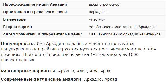 Мужское имя Аркадий является древнегреческим по происхождению. Произошло от слова «аркадос», переводящееся с греческого как «пастух». Однако трактовка имени звучит как «из Аркадии» или «житель Аркадии». Обладает интересным значением имени и сулит носителю различные положительные качества. Как правило, большинство Аркадиев общительные, позитивно мыслящие и приятные люди. Они обладают высоким творческим потенциалом и прекрасным воображением. Однако недостаток носителя имени Аркадий в том, что он слабовольный человек, легко поддающийся чужому влиянию, не способный отстаивать собственное мнение. СМОТРИТЕ ВИДЕО - ПОДРОБНЕЕ ТУТ Источник - Значение имени Аркадий: карма, характер и судьба