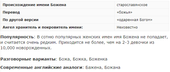 Женское имя Божена имеет славянское происхождение. Образовано от слова из древнеславянского диалекта, имеющего трактовку «благословенная», «божья» или же «одаренная Богом». Встречается как в русской, так и в украинской культуре, однако особой популярностью не пользуется. Значение имени сулит носительнице массу важных характеристик. Всем Боженам присущи такие черты, как общительность, красноречие, целеустремленность, властность и сила воли. Они легко находят общий язык с совершенно разными людьми и имеют задатки настоящего лидера. Божены не любят трусливых и слабовольных людей, а особенно, морально слабых мужчин. СМОТРИТЕ ВИДЕО - ПОДРОБНЕЕ ТУТ Источник - Значение имени Божена: карма, характер и судьба