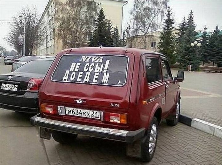 Всем привет, дорогие читатели и гости канала! Сегодня представляю вам 2-ю часть самых забавных и прикольных надписей на автомобилях! По вашим просьбам, материала чуть больше, но он ни капли не хуже. Будет интересно, так что готовьте чай и поехали! Уверен, что хоть раз Вы видели на улицах различные надписи на автомобилях, может реклама или объявление о продаже, ну или забавные цитаты или фразы. Как раз подборочку таких я сегодня и приготовил для вас. Не теряем время и начинаем прямо сейчас! Начнём с данной прелестной, внедорожной и самоуверенной "Ниве". Ну а действительно, зачем бояться? Далее на очереди, видимо, не такой уверенный автомобилист. Надеюсь, что я не один, кого бесят постоянные сигналы, особенно в пробке. Далее "Приус", который сразу предупреждает вас, что не следует ехать за ним, а то встрянете. И ещё кто-то, возможно, заметил снизу наклейку "быстрее не могу, боюсь". Ставьте лайк, если заметили сразу) На очереди позитив от владельца ВАЗа 14-й модели. А если серьёзно, то жи
