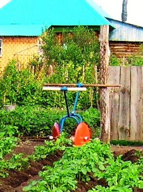 Сейчас кратко, о чём была речь в первой статье. Площадь посадки на тот момент 13 соток. Окучивать тяпками вручную, если не торопясь, не убиваясь, уходило 3 дня. Пробовали окучивать лошадью, но она тянет распашник с отвалом на обе стороны. Где узко – цепляет картошку, где широко – не достаёт, приходится вручную дорабатывать. Накупили разных плугов к мотоблоку, но и тогда мы не получили хорошего результата. Участок ощутимо наклонный и мотоблок всё время норовит сползти по склону, всё время его подправлять, 100 кг, руки отваливаются. Плюс, земля мягкая, как пух (как добились этого здесь «Земля стала как пух, была как камень»), чуть зевнёшь, закапывается, короче намучаешься больше, чем поработаешь. Опять перешли на тяпки. Тут наткнулся в интернете на интересную приспособу,