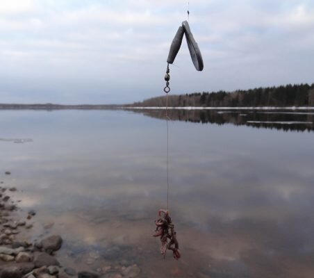 Для ловли налима на донку существует два варианта донной снасти, в первом случае используется донка-закидушка, а второй вариант предусматривает использование донки с удилищем. Донка-закидушка представляет собой мотовило, на которое намотана вся оснастка. В мае в жаркую погоду налим может стоять на значительном удалении от берега, в таком случае лучшим вариантом будет донка на базе удилища, с помощью которой можно выполнить дальний заброс. Для большей продуктивности можно использовать несколько различных донок, которые устанавливают на большом расстоянии друг от друга. Донка-закидушка для ловли налима включает около 6 метров монолески диаметром от 0.4 до 0.6 миллиметра, грузило, поводок и крючки. В данном случае подойдёт обычное или скользящее грузило плоской формы массой от 25 грамм. Масса грузила зависит от скорости течения и глубины в месте ловли. Длина поводка из монолески в зависимости от условий ловли колеблется от 10 до 15 сантиметров, а его толщина составляет около 0.45 милл