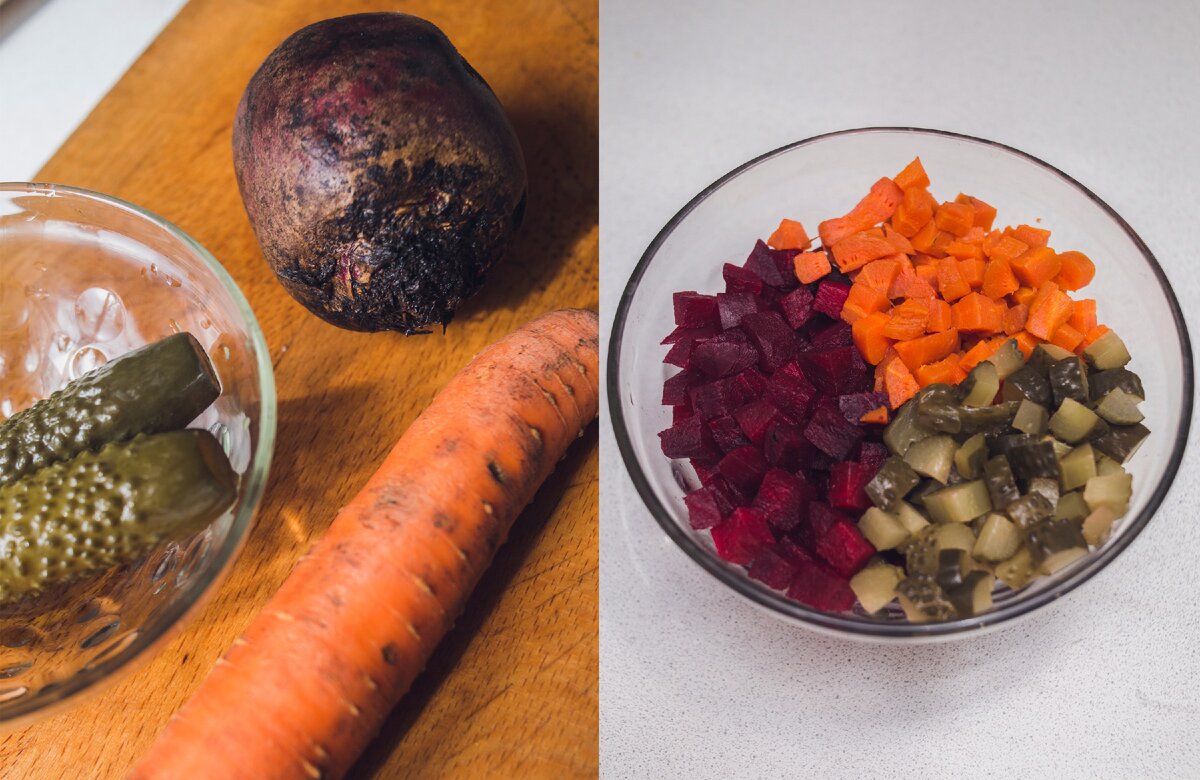 Вкусный овощной салат из отварной свеклы, отварной моркови и соленых огурцов.