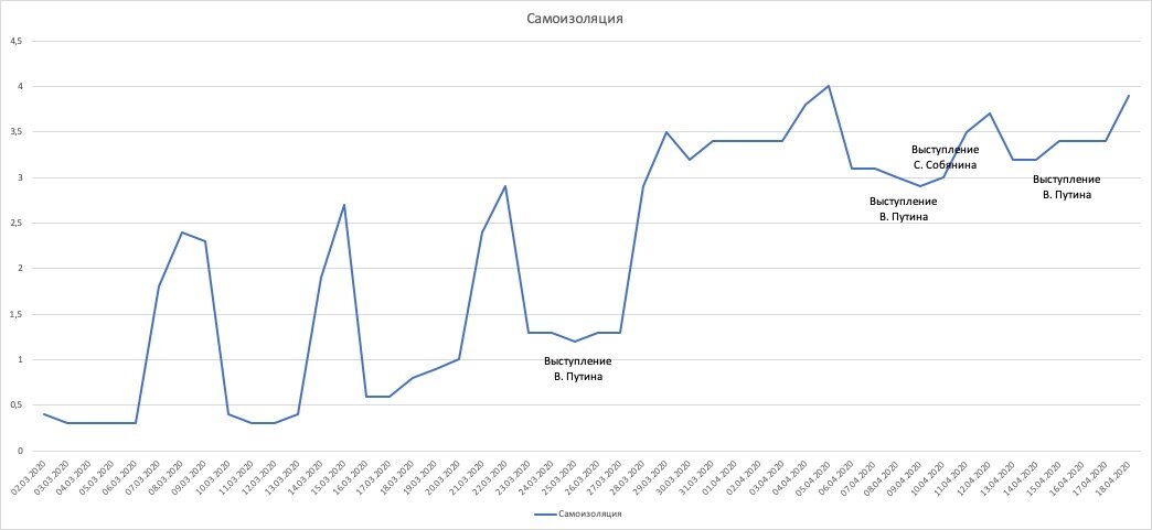 С начала пандемии коронавирусом Covid-19, корпорация Яндекс стала публиковать индекс соблюдения гражданами требований самоизоляции. Полностью алгоритм формирования этого индекса не известен, но по заявлению самой корпорации «это интегрированный показатель, рассчитанный на данных об использовании различных приложений и сервисов Яндекса». Можем предположить, что основой для подсчета индекса служит и количество автомобилей на дорогах, и количество заказов такси, и количество доставок по домашним адресам – от каждого сервиса можно получить косвенную или прямую информацию о местонахождении и передвижении людей, кто пользуются услугами приложений – то есть практически всех. Показатель имеет максимальное возможное значение – 5. То есть, видимо, когда все сидят дома. Мы построили график поведения этого индекса и обратили внимания на значимые заявления руководителей России и Москвы. Очевидно, самым мощным эффектом было первое заявление Президента России. Дальнейшие максимумы графика служили ск