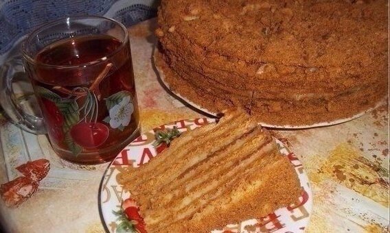 Легко готовится, очень вкусный и нежирный! Безумно вкусный крем и воздушные медовые коржи! Ингредиенты: Для теста: 2 яйца 1 стак. сахара 50 г. масла сливочного 2 ст.л. меда 2 ч.л. соды 3 стак. муки ля крема: 2 яйца 2 стак. сахара 3 ст.л. муки 350 г. масла сливочного 0,5 л. молока Приготовление: Тесто: 1. В эмалированной миске растираем яйца с сахаром и медом. Добавляем масло и ставим миску на водяную баню, пока масло не растает. Далее добавляем соду и ждем, когда она начнет пенится. В пенообразную массу добавляем муку и замешиваем тесто. Оно должно получится пластичным, слегка липнуть к рукам. 2. Делим тесто на 8 равных частей и раскатываем коржи приблизительно одинакового диаметра. Каждый корж кладем на противень и обрезаем по форме круга. Для этого хорошо подходит крышка из-под кастрюли или сковороды. Обрезки выпекаем вместе с коржами. Каждый корж выпекаем до коричневого цвета. 3. Получаем 8 одинаковых коржей и немного обрезков, которые далее послужат для прис