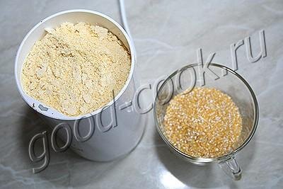 Важно при приготовлении очень мелко смолоть кукурузную крупу. Или, лучше, воспользоваться кукурузной мукой. СОСТАВ 2 яйца, 240~250г кукурузной крупы, 200г творога, 50г сметаны, укроп, 1~2 зубчика чеснока, 2/3 ч ложки соли, перец, 1 ч ложка разрыхлителя посмотреть калорийность» Перемолоть в кофемолке кукурузную крупу до состояния муки. Смешать яйца с кукурузной мукой. Добавить сметану, творог, продавленный через пресс чеснок, мелко нарезанный укроп, соль, перец и разрыхлитель.