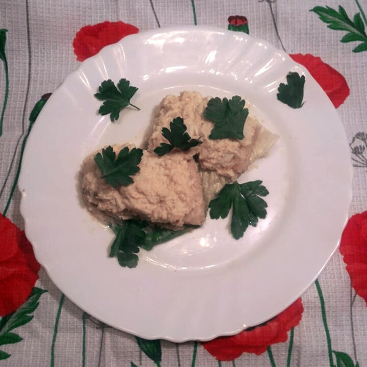 Это блюдо я впервые попробовала в Питере. С тех пор оно у меня любимое. Готовится очень просто, главное, с рыбкой не промахнуться. Поэтому рыбу покупаю со шкуркой. Пока ни разу не ошиблась. Нарезаем треску на порционные куски, промываем и в дуршлаг, пусть жидкость стечёт. Солим, перчим и добавляем специи по вкусу. Одну луковицу, мелко нарезанную, перекладываем на дно кастрюли. Треска довольно постная рыба, поэтому я подливаю чуть-чуть растительного масла, слегка бланширую лук и заливаю его горячей водой,чтобы она покрыла рыбу. Добавляю соли и перца по вкусу. Через 10 минут опускаю в кипящую воду куски рыбы, накрываю кастрюлю крышкой и варю 7-10 минут. Тем временем измельчаю заранее сваренные 2 яйца, добавляю к ним кусочек сливочного масла, подливаю несколько ложек бульона, солю перчу и хорошенько размешиваю получается такой своеобразный соус. Вынимаю рыбу на тарелку, сверху укутываю соусом... Блюдо для меня готово! А для мужа другой вариант, постный. Тушу овощи: лук, морковь, перец,
