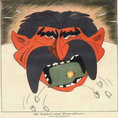 Пропаганда и политика Третьего Рейха наиболее полно раскрывается в карикатурах, основанных на противниках Германии. К тому же, зачастую под подобными карикатурами есть некий смысл или некое событие, которое повлияло на создание карикатуры. Давайте посмотрим, что нам может предоставить немецкая пропаганда времен Второй Мировой Войны. "Результаты зимнего наступления. Он укусил сталь". Зимой 41-го немцы потерпели второе поражение за всю войну. Карикатуристы, как могли, ободряли приунывших читателей. По мнению немцев, Рузвельт защищал интересы мирового еврейства, и всё правительство США подмяли под себя евреи. Поэтому он и держит канделябр, поверх флага США, символизм. - "Торпеда или бомба?" - "Ни то, ни другое — шторм". Журнал радуется успехам немецких подводников. "Информация из США". Когда говорит американское радио, правда стоит вверх тормашками. "Его путь "освобождения" Европы". По мере того, как война приближалась к финалу, образ врага в немецкой прессе принимал поистине чудо
