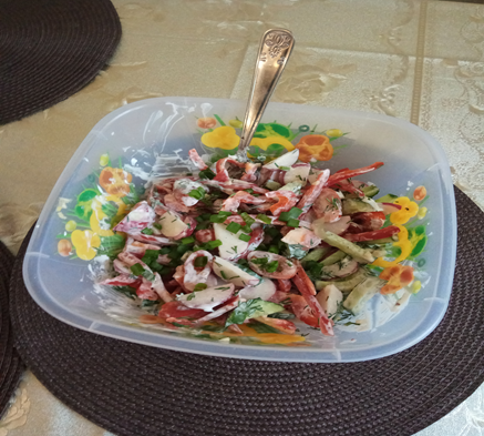 Вымытые овощи нарезаем, выкладываем в салатник, добавляем мелко порубленный чеснок. Заправляем двумя ложками сметаны.