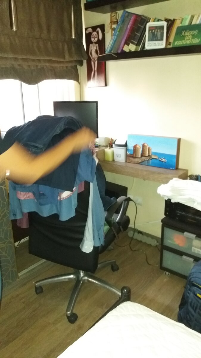 «Сегодня обнаружила у себя в архиве интересное фото. Оно было сделано в квартире, которую снимал мой сын, в которой его и убили два года назад. Фото сделано на 8 день после убийства. На фото слева кресло, на котором висит одежда моего сына. Вот этого желтого пятна среди одежды быть не должно. Не было ничего такого цвета среди его одежды. Фото не подвергали обработке. Солнечных бликов в квартире не было. Причём сверху рубашек лежат джинсы, которые мой сын не носил летом. Они должны были лежать в чемодане. Джинсы кто-то достал, вынул из них ремень на котором потом подвесили тело сына. Желтое пятно заползло под джинсы и приподняло как бы их над одеждой. В тот день с утра мы похоронили сына, после этого поехали в полицию, затем попросили нотариуса, который опечатывал квартиру пройти на минутку посмотреть на место. Квартира до этого была закрыта с момента когда вынесли оттуда тело сына. Что это? Какая-то энергия или призрак моего сына»? Смотрим саму квартиру. Эта квартира, где должен