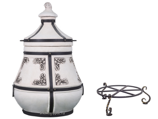 Тандыр обладает стильным корпусом изготовленным из шамотной глины с нанесенным орнаментом. Для безопасной эксплуатации и дополнительной надежности он опоясан металлической полосой, на которой сделан крепеж для сопутствующего инвентаря. В комплекте все необходимые для эксплуатации аксессуары – совок, кочерга, колосник.