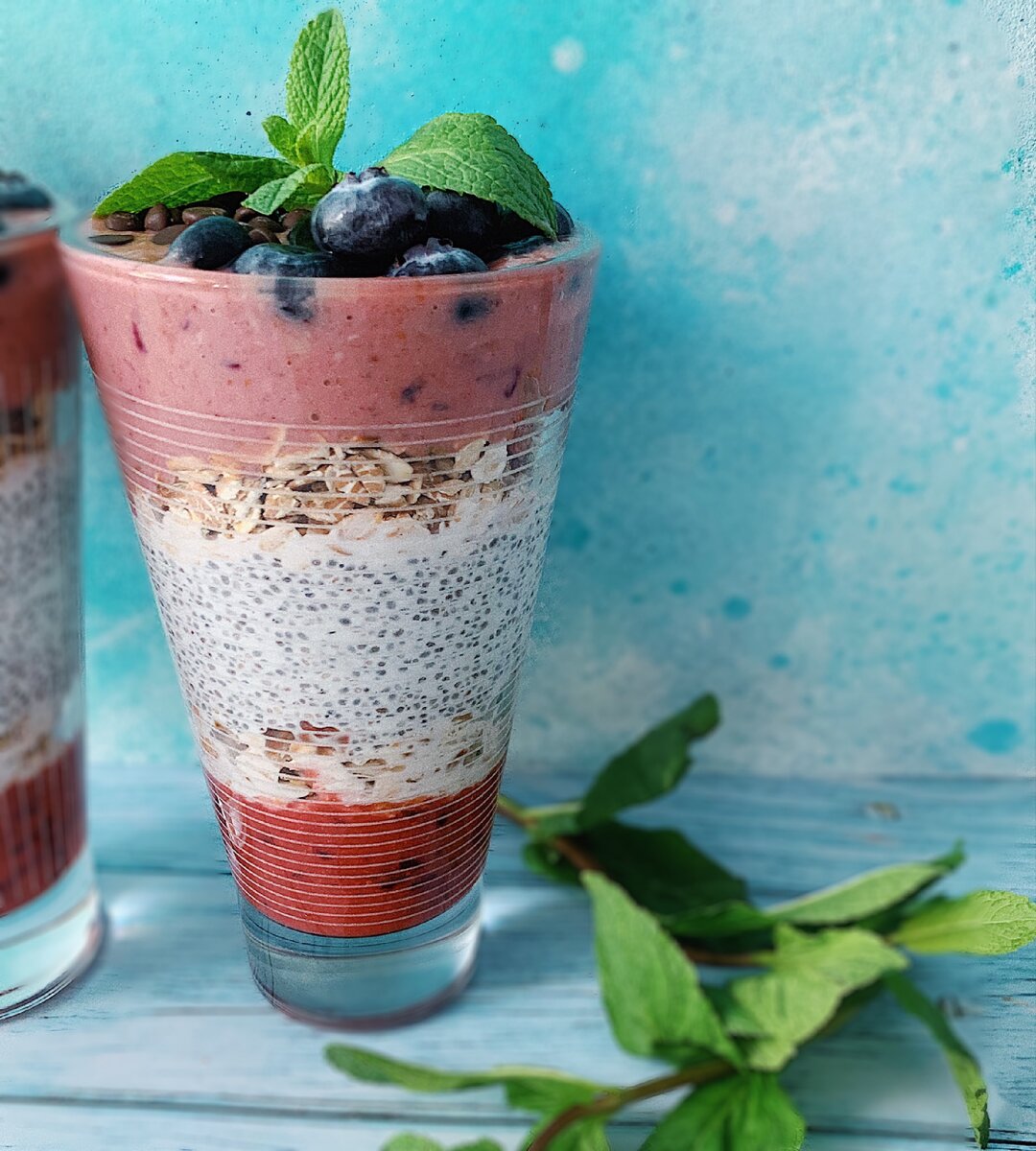 Сбалансированный, сытный, вкусный и необычайно красивый завтрак. Чаще всего ингредиенты - это фруктовое пюре из свежих ягод асаи (либо пюре из других фруктов вместе с порошком асаи), семена чиа, кокосовое или миндальное молоко, овсяные хлопья. Вариаций тысячи на любой вкус. Один из рецептов, который я считаю беспроигрышным: Ингредиенты на 2 порции: 3,5-4 ст ложки семян чиа, 0,75 стакана кокосового молока, 1 столовая ложка порошка асаи, 100г ягод (голубика/клубника/малина и тд), 1 банан, мюсли 8 столовых ложек, 1 столовая ложка миндальной пасты и кокосового масла, 2 столовые ложки кокосовой стружки, свежая мята. Слой 1. Измельчаем ~40г ягод (у меня голубика и клубника) вилкой или блендером, выкладываем на дно стакана. Слой 2 (чиа). В отдельной миске заливаем 4 столовые ложки семян чиа 1 стаканом кокосового молока, оставляем семена набухать в течение получаса в холодильнике. Затем разделяем смесь пополам и выкладываем вторым слоем в стаканы поверх ягод. Оставляем на 15 минут в хо