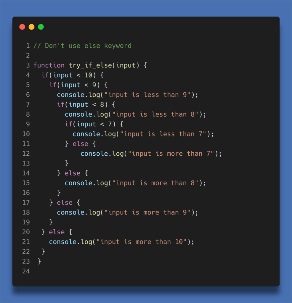 Ключевые слова if-else являются базовыми почти в каждом языке программирования. С их помощью можно создавать простую условную логику, понятную каждому. Скорее всего, если вы программист, вы знакомы с “else”. Но если вы хороший программист, вы его не используете. Почему? Я считаю, что нужно избегать использования if/ else if, так как это чрезвычайно загромождает код. Описывать условные выражения можно с помощью операторов if, которые должны быть взаимоисключающими и не зависеть от порядка выполнения. К тому же это заставляет писать все условия, необходимые для обработки данных, в начале каждой функции. А если для обработки сложных условий использовать полиморфизм, то код станет еще более понятным и читабельным. (State Pattern). если большое условие используйте switch Пример Правила: