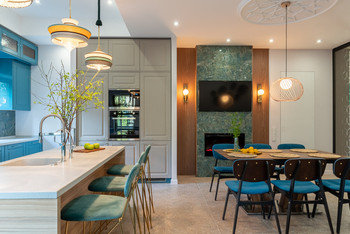 Для части фасадов был выбран сочный бирюзовый цвет, Этот цвет возник неслучайно: Узбекистан заменит своими месторождениями бирюзы. Мы сделали акцент на геометрии пространства и, следуя урокам Пита Мондриана, «раскрасили» нашу кухню и фасады в разные цвета как геометрические фигуры – квадраты и прямоугольник.