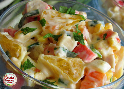 Всем привет! Крабовье с апельсинами Для праздничного застолья это блюдо будет в самый раз. Подобранные ингредиенты являют собой разнообразие ярких красок. И более того, является очень сытным и калорийным.