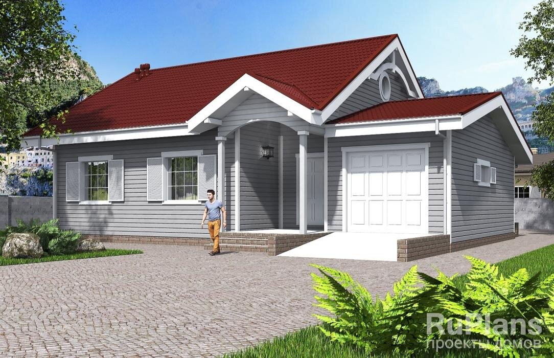 Проект небольшого одноэтажного дома из бруса площадью 120 квадратных метров. В доме три спальни, гараж и терраса.