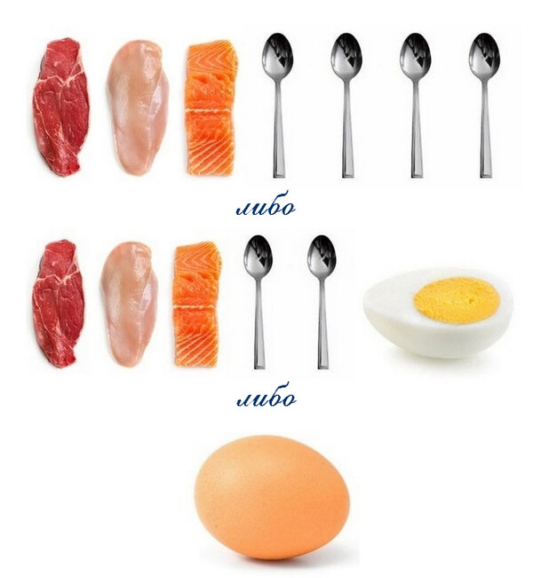 В столовой ложке примерно 15 г мяса/рыбы. В одном яйце без скорлупы — приблизительно 50 г.