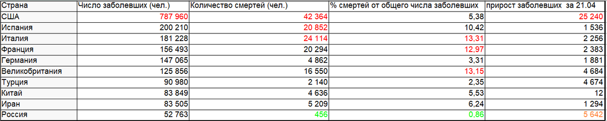 Доброго времени суток, дорогие читатели. Буквально вчера стало известно, что Россия обогнала Бельгию и поднялась в "печальную" десятку стран по распространению Covid-19. Посмотрим на статистику "печальной десятки". В лидерах неизменно США: общее количество заболевших, смертей, а также прирост за 21.04.2020. В тройке вместе с США страны Европы - Испания, Италия. В Испании счетчик перевалил за 200 000! Также выделяется некая "большая шестерка" стран по числу заболевших 100 000+. Россия идет на 10 месте, значительно отставая, к счастью, от 9го Ирана. По количеству смертей у РФ наилучшие показатели десятки, да и не только десятки. В Китае, как мы видим жесткий спад по росту заболевших +12 человек за сутки. Единственный показатель у России, который удручает - прирост за 21.04.2020. Тут у нас вторая позиция - уступаем только рекордсмену за океаном. Главная задача - удержать количество летальных исходов. Для этого нужно уменьшить прирост заболевших. Так что, дорогие читатели, соблюдайте самои