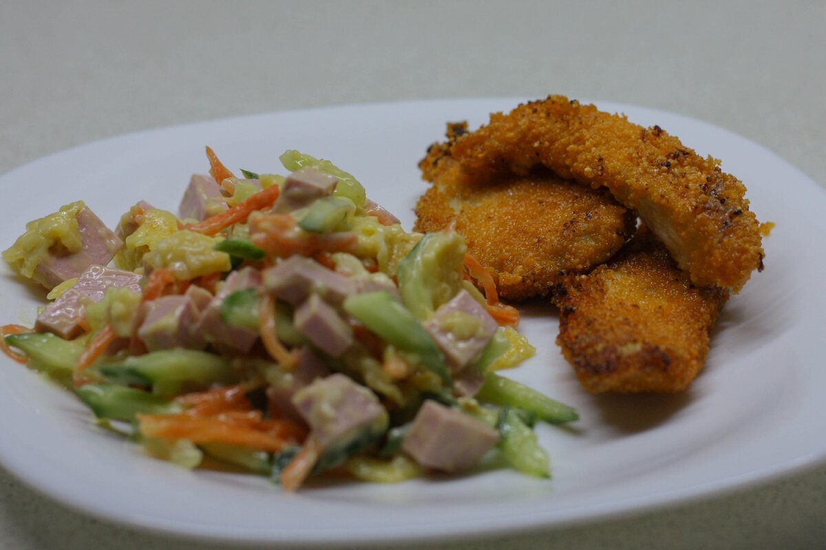 Всем хорошего настроения! Рецепт курочки, очень вкусная и сочная! Обязательно попробуйте! Большая просьба подписаться на канал, поставить "палец вверх" Поддержите начинающего Фудблогера. Стараюсь для Вас! Ингредиенты по традиции внизу страницы Начнём: 1. Берём 1 куриную грудку (весь расчет будет исходить из этого). Режем на полоски небольшого размера. Смешиваем 50 мл. соевого соуса, 2 ст.л майонеза, 1 яйцо и 1 ст.л горчицы. Добавляем к нарезанной курице перемешиваем и в холодильник на ночь. 2. В тарелку или миску насыпаем панировочные сухари, обваливаем курочку. 3. На среднем огне жарим до готовности. 4. Наши наггетцы готовы. Обещаю, это очень вкусно, только не жалейте времени, дайте хорошо замариноваться курочке. Ингредиенты: 1. Куриное филе - 1 шт 2. Соевый соус - 50 мл. 3. Горчица - 1 ст.л 4. Майонез - 2 ст.л 5. Яйцо - 1 шт 6. Панировочные сухари 7. Растительное масло Спасибо, что дочитали до конца, подписывайтесь! Нажимайте "палец вверх".
