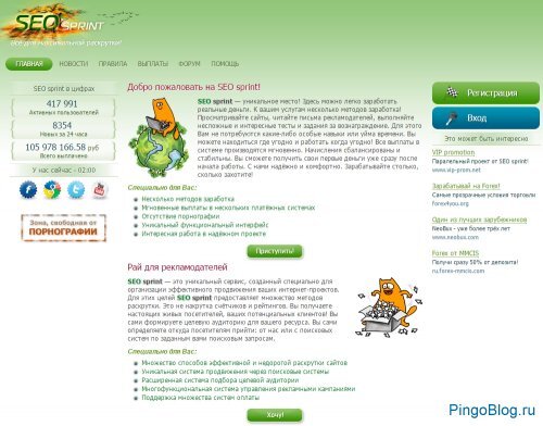 SeoSprint появился на свет в декабре 2010 года. Как показывает статистика, опубликованная на самом сайте, за все это время через него было выплачено свыше 105 миллионов рублей. Число активных пользователей исчисляется сотнями тысяч, и каждый день сюда приходит порядка 8 тысяч новичков. Со всеми этими цифрами можно ознакомиться в разделе «Выплаты» или на главной странице сайта. Здесь же короткая информация о буксе: что он собой представляет SeoSprint и как с его помощью можно зарабатывать.