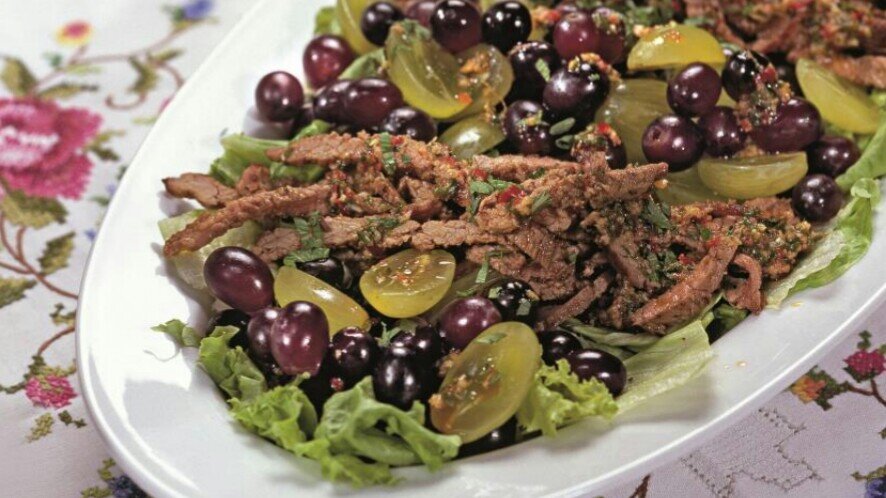 Нам потребуется : Говяжья вырезка 500 грамм Растительное масло 2 ст.л. Белыу,чёрный виноград по 100 грамм Острый перец 1 шт. Чеснок 3 зубчика Корень имбиря (очищенный) 2,5 см Кинза 2 ст.л. Коричневый сахар 2 ч.л Листовой салат 150 грамм Кунжутные семена жареные 1 ч.л Соль, перец по вкусу Мясо обжарить в разогретом масле, по 5 мин.с каждой стороны и нарезать тонкими полосками. Посыпать кунжутными семенами. Ягоды винограда разрезать пополам. Листья салата крупно нарвать. На большое блюдо выложить зелёный салат, сверху выложить диагональными полосами мясо и виноград. Измельчить в блендере перец, чеснок, имбирь и кинзу. Добавить сахар, соль и перец. Приятного аппетита! Подписывайтесь на мой канал чтобы не пропустить ещё больше простых и вкусных рецептов. Если Вам понравилась статья, поставь пальчик вверх)