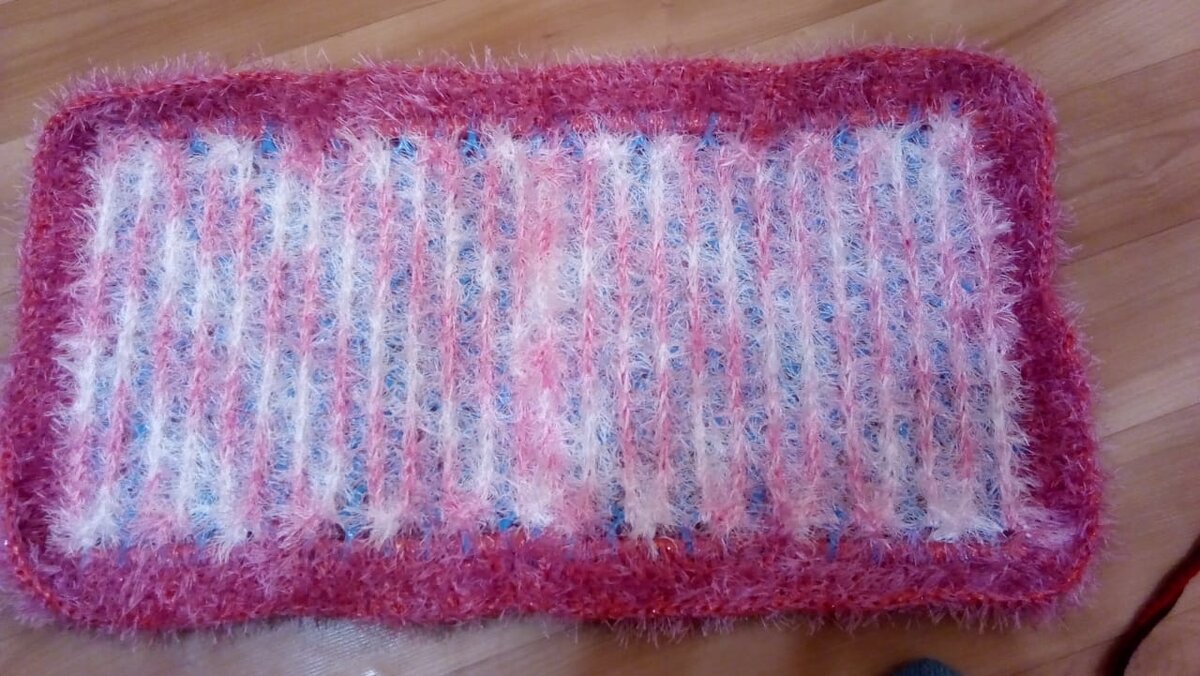 Я наверно не единственная, кто сидя на самоизоляции дома, начала лезть в труднодоступные уголки своей квартиры. И как много полезного там оказывается лежит! мама дорогая! На антресолях балкона я обнаружила строительную сетку, остатки от ремонта. Хороший такой кусок. Примерно 1,5 длиной. Завтра найду сантиметр и точнее замеры сделаю. А пока... ну чего лежит-то, надо ей срочно применение найти. И тут я вспомнила, что пару месяцев назад, я творила коврик в туалет. Были у меня мягкие пластиковые решетки, которые обычно в раковину закидывают, и решила я их соединить и обвязку сделать. Обвязала внутри пряжей травка столбиком без накида. Начинала вязать с правого нижнего угла вверх, дошла до конца края и там делала поворот. На обвязку по краю тоже пошла "травка" цветом темнее + полипропиленовая нить, из которой мочалки вяжут. Размер этого малыша 33см*60см. По итогу коврик получился просто отличный -стирается в машинке на режиме быстрой стирки, сохнет очень быстро. Не линяет, ничего с него