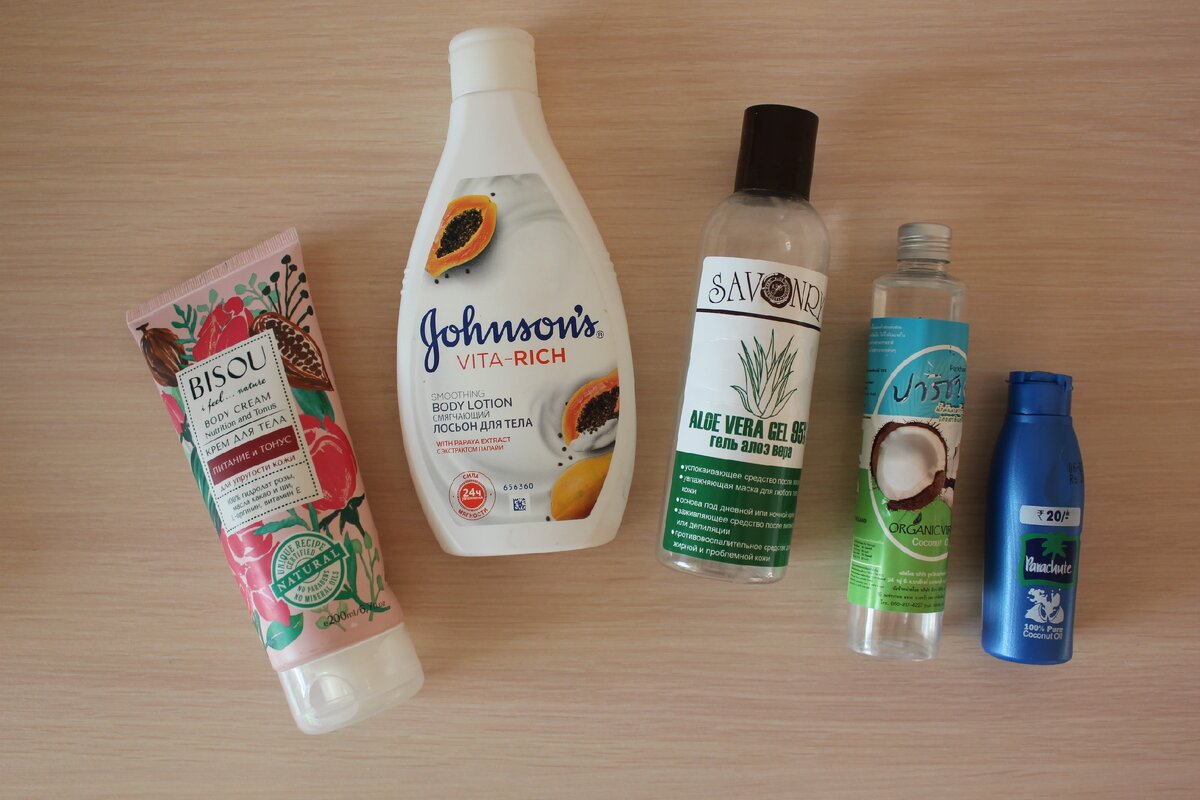 Крем, лосьон, гель алоэ или кокосовое масло? Делюсь своим мнением об уходовой косметике для тела. 1) Крем для тела BISOU Объем 200 мл. Питание и тонус Этот крем мне подарила подруга. Сразу понравился его запах и то, что быстро впитывается, не оставляет жирную пленку. В составе есть гидролат розы, масло какао и ши, L-аргинин и витамин E. Достоинства: Недостатки: Но это и так понятно. Для упругости кожи нужен комплексный уход: спорт, скрабы и крема. Крем понравился. Куплю такой еще раз. 2) Лосьон для тела Johnsons Объем 250 мл. Смягчающий со вкусом папайи Купила в семейном магните по акции. Знаю, что это хорошая марка и не сомневалась в качестве. Только есть одно "но". Достоинства: Недостатки: Мне понравился лосьон всем, кроме запаха. Поэтому мажу им только ноги и чередую с другими кремами. Не знаю, почему не догадалась открыть в магазине. Если покупать еще раз, то с другим вкусом. 3) Гель алоэ вера SAVONRY Объем 200 мл. Хотела купить корейский гель Холика, но увидела этот. Он стоит де