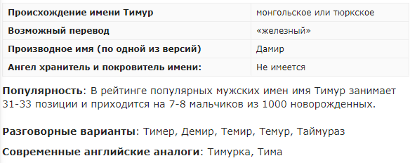 Мужское имя Тимур имеет множество версий происхождения, но главная из них свидетельствует о монгольском происхождении и имеет трактовку «железо». Возможна связь и с татарским именем Дамир, ставшим основой для многих национальных имен. Обладает ярко выраженной энергетикой и интересной значимостью. Имя Тимур наделяет носителя такими важными и положительными качествами, как активность, подвижность, замечательное воображение, действенность, прекрасная интуиция и коммуникабельность, дружелюбие. Умение общаться и находить общий язык абсолютно со всеми – это своеобразный дар всех Тимуров. СМОТРИТЕ ВИДЕО - ПОДРОБНЕЕ ТУТ Источник - Значение имени Тимур: карма, характер и судьба