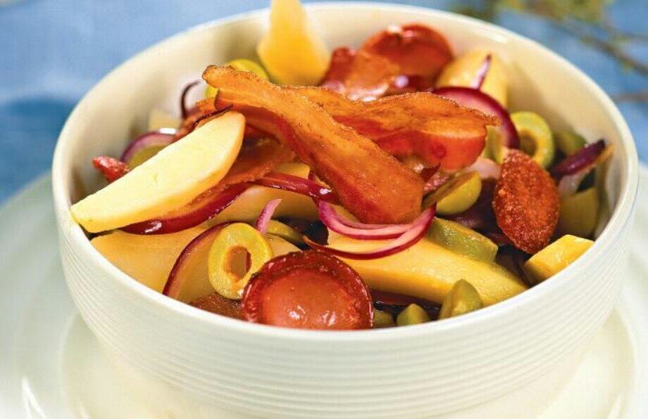 Нам потребуется : Крупный картофель 4 шт Красный лук 2 шт Оливки 100 грамм Бекон 200 грамм Копченые сосиски 200 грамм Копченые колбаски 200 грамм Масло подсолнечное 1 ст.л Соль, перец по вкусу Картофель отварить в мундире. Очистить, нарезать и сложить в миску. Влить 4-5 ст.л рассола из под оливок. Дать постоять 10 мин. Лук нарезать полукольцами. Оливки, сосиски и колбаски нарезать кружками, бекон толстыми полосками. Расколить сковороду, обжарить бекон. Переложить их в отдельную посуду. На этой же сковороде обжарить лук 3 мин. Добавить сосиски и колбаски, готовить 2 мин. Выложить в миску к картофелю, добавить оливки и бекон. Перемешать. Посолить и поперчить, заправить маслом. Приятного аппетита! Подписывайтесь на мой канал чтобы не пропустить ещё больше простых и вкусных рецептов. Если Вам понравилась статья, поставь пальчик вверх)