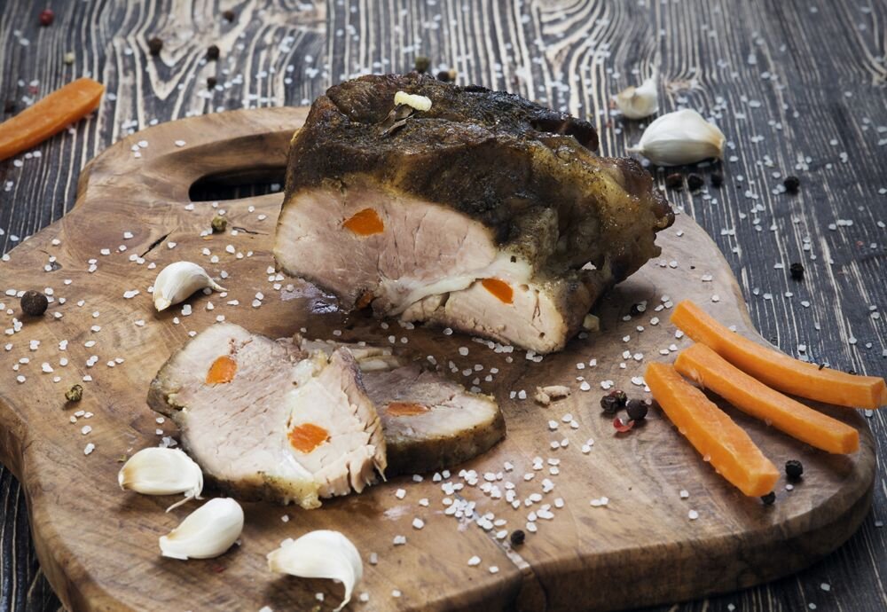 Отличную буженину можно приготовить не только традиционным способом в фольге в духовке, но и в мультиварке. Мясо получается нежным и главный плюс - можно не бояться, что оно пересушится, что с бужениной в духовке иногда случается. Если вы из той породы кулинаров, которых тяготит стояние у плиты и необходимость проверять блюдо - берите этот рецепт на вооружение. В процессе запекания эта буженина потребует минимум вашего внимания: один раз, чтоб ее перевернуть и второй раз, чтоб переключить программу. свинина (окорок или карбонад) - около 1,5 кг морковка среднего размера - 1 шт. чеснок - 5 зубчиков горчица дижонская с зернышками - 2 ст. л. масло растительное - 1 ст.л. для маринада + 1 ч.л. для смазывания дна мультиварки соль - 1 ч.л. или больше по вкусу черный перец горошком - 1 ч.л. лавровый лист - 2 шт. прованские травы - 2 ч.л. Мясо - карбонат или окорок - обмойте и хорошо обсушите бумажным полотенцем. Очищенные чесночинки разрежьте на половинки. Морковку почистите, нарежьте недлинны