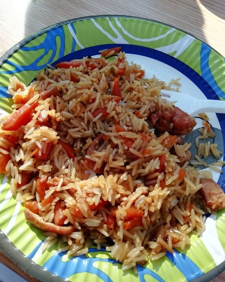 Снова наша постоянная рубрика в Instagram - рецепты на костре от @mariyka.0606. В этот раз в меню плов из куриных бедрышек в новом казане на костре на природе. ➡️Ингредиенты: 🔹куриные бедра без кости 700 гр, 🔹лук 2 шт, 🔹морковь 2 шт, 🔹чеснок, 🔹рис 2,5 стакана, 🔹масло, 🔹соль, перец, специи для плова. 🔷Разогреваем казан, наливаем масло. 🔷Когда масло накалилось, кладём лук, обжариваем, затем мясо, обжариваем, затем морковь. 🔷Обжариваем всё вместе до полуготовности мяса. 🔷Заливаем водой, чтобы вода покрывало мясо. 🔷Доводим до кипения, солим, перчим, специи по вкусу, головку чеснока немного обрезаем, кладём в казан, убавляем огонь и тушим 20 мин. 🔷Промываем хорошо рис, закладываем в казан. Если воды мало и она не покрывает рис, то добавляем воду. 🔷Закрываем крышкой и ждём ещё 30 - 40 минут, до готовности риса. Приятного аппетита)