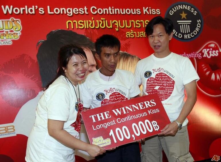 Целоваться любят многие, однако если есть желание попасть в книгу рекордов Гиннеса, возможно, это занятие покажется не таким уж привлекательным, т.к. придется не отрываться друг от друга долгое время, что, оказывается, не так уж просто. Рекорд по самому долгому беспрерывному поцелую был установлен в Таиланде. Девять тайских пар, среди которых были и пенсионеры, собрались накануне праздника всех влюбленных, чтобы побить прошлый мировой рекорд, который был установлен в Патайе . Напомним, что тогда победила пара гомосексуалистов, которая целовалась без остановки 50 часов 25 минут. По правилам все это время влюбленные не могли прерываться на обед, если не считать перекусов через трубочку. Также им приходилось вместе ходить в туалет, но при этом губы партнеров не должны были отрываться друг от друга. Победители смогли получить кольцо с бриллиантом, стоимость которого около трех с половиной тысяч долларов, а также подарочный ваучер в гостиницу на целых семь тысяч долларов. Однако новы