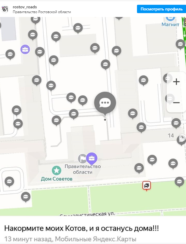 Жители Ростова-на-Дону (Первый город начавший виртуальный митинг) , Екатеринбурга, Москвы, Красноярска и Казани вышли на виртуальные митинги против режима самоизоляции. Скриншотами этих публикаций так и пестрят Твиттер, Инстаграм и «ВК». Скопления на улицах в период пандемии официально запрещены. Люди устроили виртуальные митинги, собрались больше двух, и ничего не нарушили)) Участники митинга использовали приложения «Яндекс. Навигатор» и «Яндекс. Карты", также их функцию «Разговорчики» .
