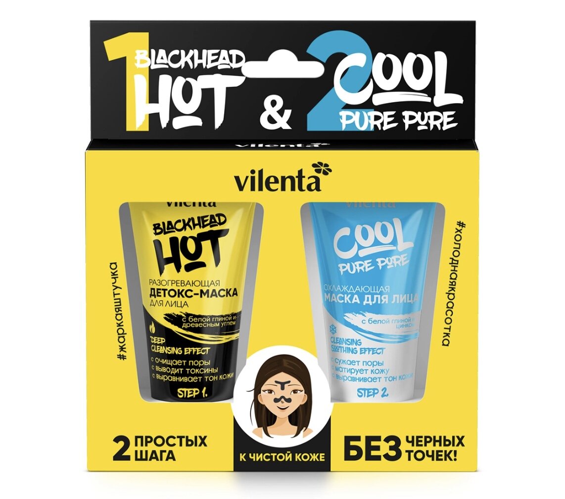 Цена: от 204₽ (продаются в наборе 2 шт) Сегодня расскажу о масках Vilenta, работаю они в паре. Маска №1 и маска №2. Итак Step 1. Разогревающая детокс маска. Маска имеет темный цвет, консистенция у неё кремовая , с мельчайшими скабирующими частицами. В применении маска удобна. Эффект: разогревает кожу , создаёт ощущение бани, очищает поры , улучшает цвет лица , выводит токсины. Активные компоненты: белая глина, древесный уголь. Цена/качество: за такие деньги это очень хорошее средство. Мне маска очень помогла и понравилась. Качество продукта хорошее, обязательно куплю ещё раз. Step 2. Охлаждающая маска для лица. Имеет густую консистенцию, голубая. Эффект: маска охлаждает , сужает поры, матирует кожу , контролирует выработку себума , выравнивает цвет лица. Активные компоненты: белая глина, цинк Цена/качество: достойная маска для ее цены. В паре маски работаю достаточно эффективно , справляются со своей задачей. Обязательно приобрету ещё раз данный товар.