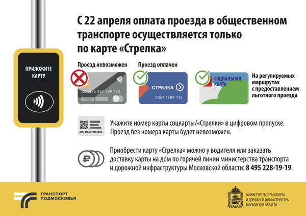 На общественном транспорте Подмосковья с 22 апреля будут действовать только электронные средства оплаты проезда — карты «Стрелка», «Тройка» или социальная карта, соответствующее постановление подписал губернатор Московской области Андрей Воробьев.