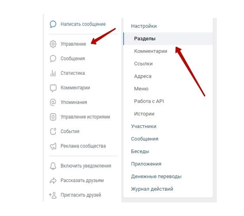 В правом меню вашей группы или страницы нажмите на раздел «Управление». Далее нажмите на пункт с разделами.