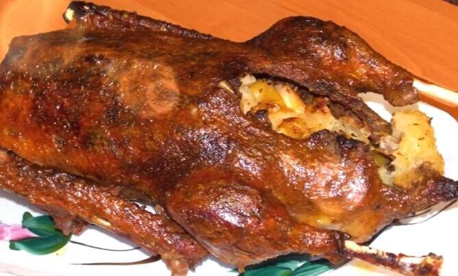 Категорически запрещено натирать гуся соусом из горчицы и меда с внешней части, потому что он постоянно пригорает и дает запах горелого мяса. Шею и крылья обязательно пришивают к тушке, чтобы они не выпрямились и не разорвали рукав для запекания. Удобнее всего подготавливать тушку с вечера, поскольку потребуется примерно 8-12 часов, чтобы гусь промариновался.