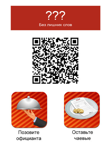 Было принято решение собрать прототип системы для демонстрации ресторанам. За 5 дней мы сделали мобильную версию сайта с двумя кнопками: «Вызвать официанта» и «Попросить счет», Node.JS сервер, принимавший запросы и отправлявший их в ресторан. Также почти своими силами сделали макет тейбл-тента (кто назвал так эти рекламные треугольники на столах?), заказав на фрилансе отрисовку двух иконок. И все это работало в тепличных условиях.