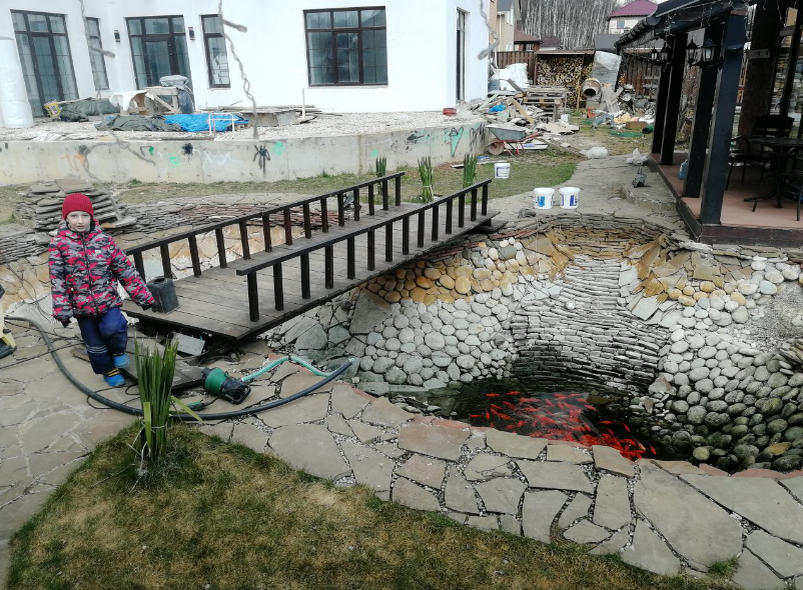 Моему пруду на участке уже 8 лет. Завел как-то 4 рыбки, затем в первый год они принесли приплод более 130 штук. Сейчас в год добавляется примерно по 3-5 штук. Чуть позже расскажу почему так мало, как ухаживать за прудом и что можно, а что нельзя. Начну с характеристик. Мой пруд имеет вместимость 32 куба. Делался по классической технологии когда дно застилалось пленкой, затем сетка и декор камнем.