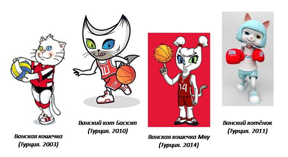 Канал MascotLand завершает этой публикацией начатый в 1-й части рассказа о кошках, которым был предоставлен шанс навсегда войти в историю международных спортивных соревнований и стать их неотъемлемой частью. Ванская кошечка присутствовала на XXIII ЧЕ по волейболу среди женщин. Пушистый, белоснежный ванский кот Баскэт (Bascat) с разноцветными глазами – голубым и жёлтым – символ XVI мужского ЧМ по баскетболу. Ещё одна ванская кошечка Мяу (Miau) и подруга уже упомянутого кота Баскэт стала олицетворением женского баскетбола на ЧМ. Все три чемпионата проводились в Турции в 2003, 2010 и 2014 годах, соответственно. Другой представитель породы стал символом ЧЕ по боксу 2011 года. В начале Нового года, по традиции, в Турции играются «свадьбы» знаменитых ванских кошек, которые организуются по специальному разрешению специалистов-экологов. Это делается для защиты кошек-эндемиков, численность которых чуть более одной тысячи. Коты с озера Ван, что на юго-востоке Турции, поражают всякого, кто