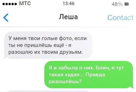 Я подготовил для вас четвертую часть смешных переписок как всегда на высшем уровне! У меня твои голые фото Ушел в себя Вы еще отдаете телефон? Ты правда Криштиану Роналду? Братан, можешь подкинуть до дома? Я мужик! Сколько у тебя денег, если мериться кучками? Знаешь, почему мы расстаемся? Девушка поймала букет невесты Что хужe, незнание или безразличие? Бесстрашный Я так понимаю, мы расстаемся? Что ты делалa? В доту играла Чем занимаетесь, Диана?