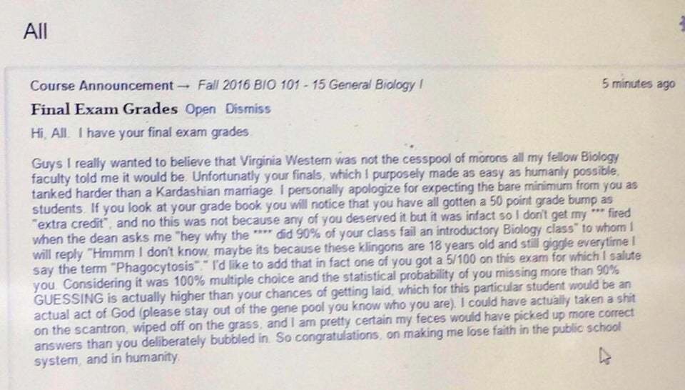 Всем привет. Я проставил оценки за контрольную Ребята, мне бы очень хотелось верить в то, что Вирджина Вестерн не отстойная яма полная идиотов, как рассказывал мне мой коллега - преподаватель биологии. К сожалению, контрольную, которую я специально сделал настолько простой, насколько это возможно запороли сильнее чем Кардашьяны свой брак. Лично я извиняюсь, что ожидал от вас как от учеников абсолютного минимума. Если вы посмотрите в дневник, вы заметите, что я накинул 50-баллов каждому как "дополнительный зачет". И нет, это не потому что вы это заслужили, а чтобы меня не уволили, когда директор спросит меня "эй, какого хера 90% вашего класса завалили вводный урок биологии", которому я отвечу: "Хммм, не знаю. Может быть, потому что этим клингонам по 18 лет и они хихикают каждый раз, когда я произношу "фагоцитоз"? Хотел бы отметить, что на самом деле один из вас получил 5/100, и тут я стоя отдаю честь. Учитывая то, что контрольная на 100% состоит из вопросов с несколькими вариантами, ст