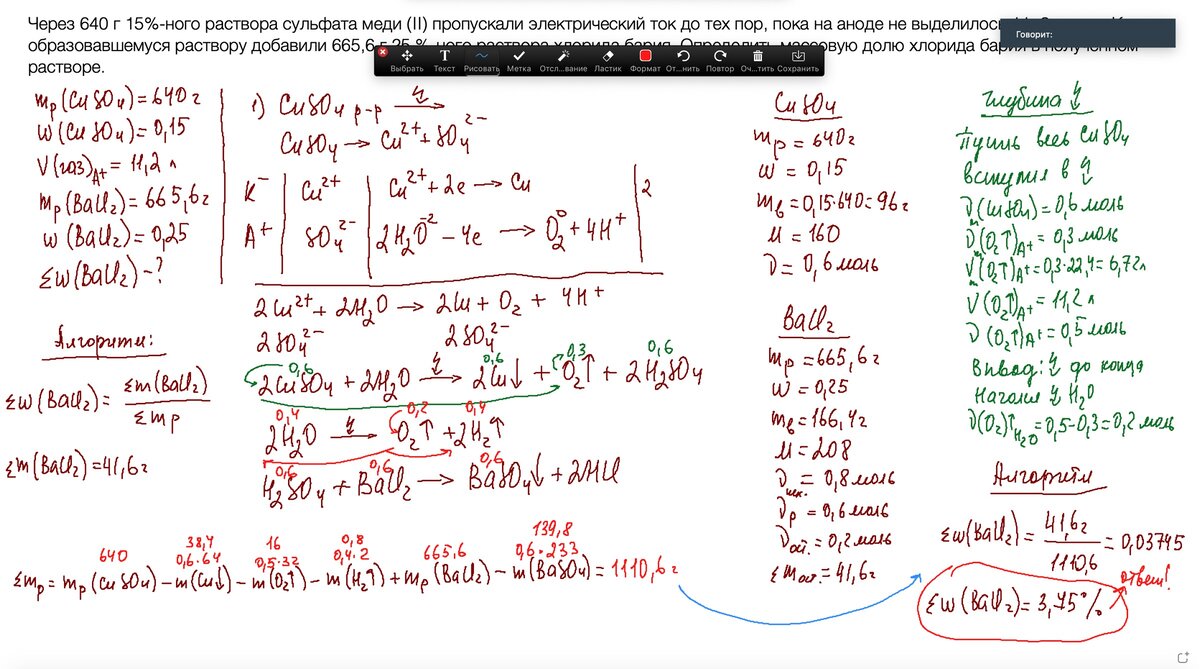 Через 640 г 15%-ного раствора сульфата меди (II) пропускали электрический ток до тех пор, пока на аноде не выделилось 11, 2 л газа. К образовавшемуся раствору добавили 665,6 г 25 %-ного раствора хлорида бария. Определить массовую долю хлорида бария в полученном растворе