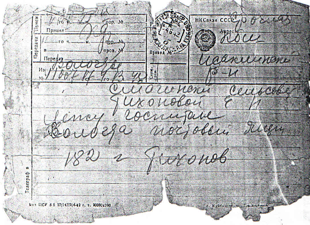 В январе «Самарская газета» обратилась к читателям: если в ваших семейных архивах сохранились письма с фронта, фотографии военных лет, дневники, сообщите в редакцию. Начали приходить отклики, все больше и больше. В семьях, где десятилетиями бережно хранят эти свидетельства войны, они своего рода святыня. В семье Малиновских из поколения в поколение передается фронтовая реликвия — самодельная алюминиевая ложка. — С нею прошел войну мой дед, Василий Емельянович Тиханов, — рассказывает Галина Малиновская. — Эта ложка — свидетель фронтовых дней и ночей. Дед как будто побывал на самой грани человеческих возможностей. После сильнейшей контузии при взрыве немецкого боеприпаса его комиссовали в 1944 году и привезли домой в сопровождении медсестры. Он еще долго и тяжело возвращался к жизни без грохота канонады. То уходил в лес, где его искали всей деревней, то копал ямы и прятался в них. Много месяцев не говорил. Война — это страшный психологический излом. Кроме ложки и фотографии 40-х годо