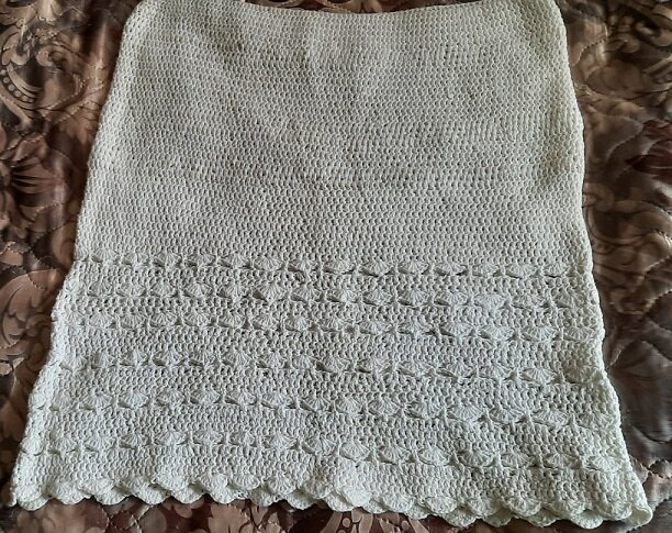 Совет:Нужно сделать выкройку в натуральную величину.Измерить себя.Через 24 сантиметра от пояса, ширина юбки должна быть 94 сантиметра.Наложив работу на выкройку, вы увидите когда следует перейти на более толстый крючок