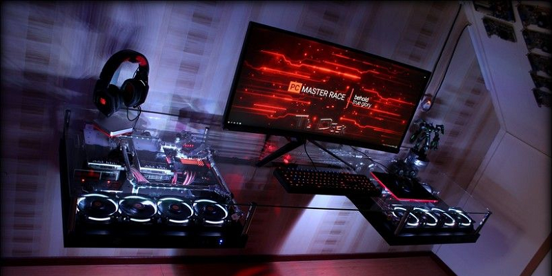 Увы — такое расположение платы в столешнице сильно ограничивает максимальную высоту кулера, всего до 90 мм, однако места под СВО предостаточно. Также из удобных фишек — можно регулировать высоту такого стола. К слову, столешница сделана из закаленного тонированного стекла и не боится царапин, а в остальном стол полностью алюминиевый. Стоит он, разумеется, немало — целых $990 на Amazon.