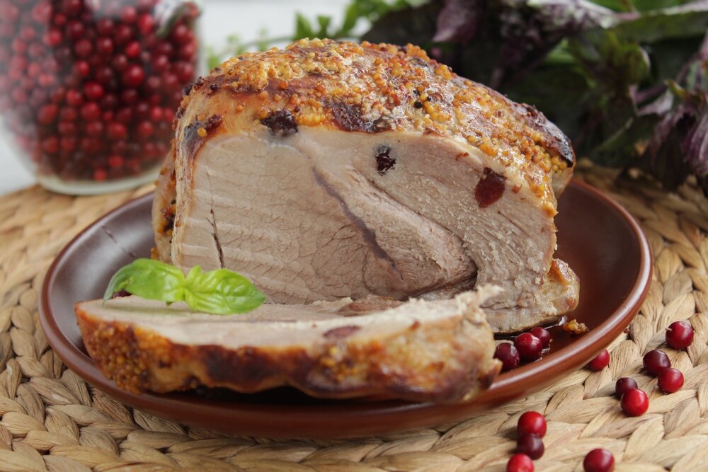 Ингредиенты: Способ приготовления: Шаг 1 Мясо натрите солью и перцем, оставьте на пару часов. Затем часто нашпигуйте мясо ягодами вяленой клюквы. Шаг 2 Обжарьте мясо на раскаленном масле до румяной корочки с обеих сторон. Шаг 3 Выложите мясо на фольгу, смажьте смесью меда, горчицы, паприки и сушеного чеснока. Шаг 4 Заверните в фольгу, но не плотно. Запекайте в духовке 30 минут при 240 °С, затем 1 час при температуре 220 °С. По истечении времени мясо достаньте из духовки. Дайте постоять 15 минут в фольге, не открывая. Затем раскройте, нарежьте на кусочки. Больше рецептов домашней буженины смотрите на сайте «Едим Дома»!